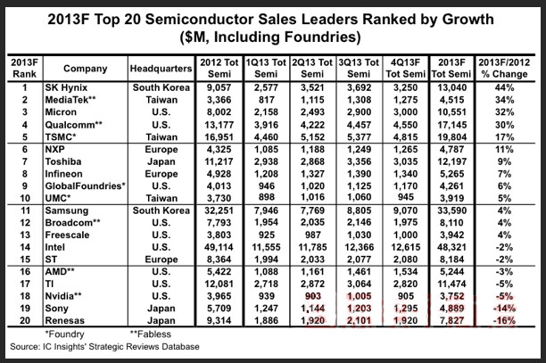 IC Insights公布初步估计2013年全球前二十大半导体厂商营收排行榜