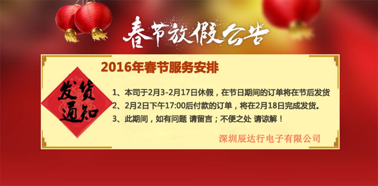 我司春节放假定于2月3日-2月17日,在此期间有什么不便之处敬请谅解,也提前祝大家新年快乐 生意兴隆!